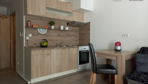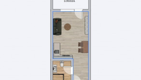 Dispozícia: vstupná chodba so vstavanou skriňou, izba s kuchynskou časťou a východom na loggiu, kúpeľňa s WC a sprchovacím kútom