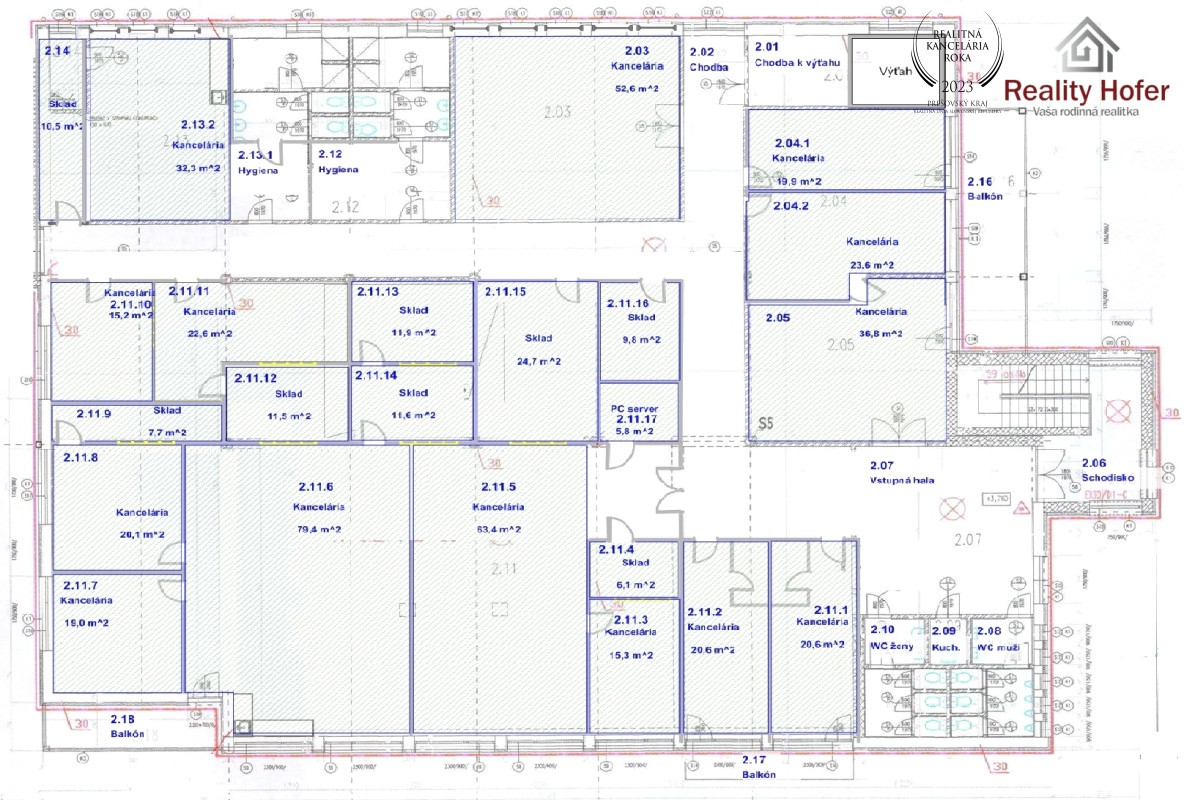 Dispozícia: vstupná hala, 14 miestností (kancelárie), 8 miestností využívaných ako sklad alebo technické miestnosti (serverovne), 2x sociálne zariadenie muži/ženy + sprchy a šatne, kuchynka, nákladný výťah, 3x balkón, 2 vstupy,