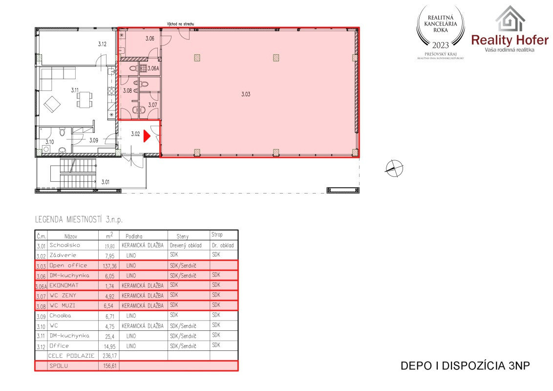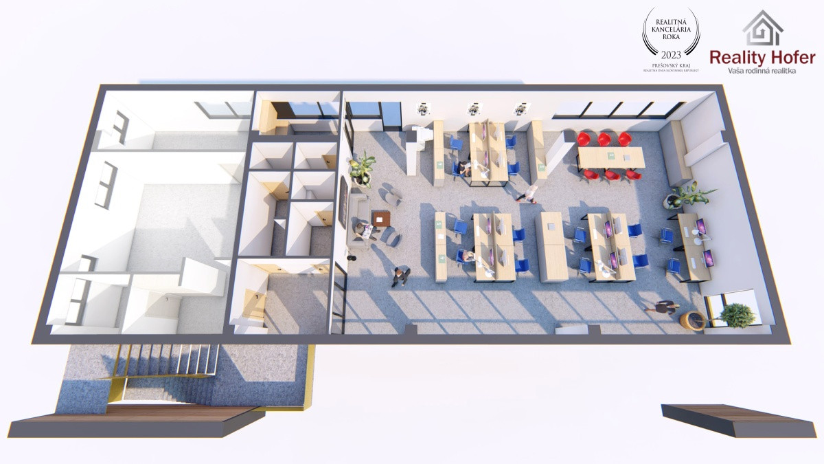 Dispozícia – vstup, samostatné WC muži/ženy, veľký otvorený priestor - kancelária, kuchynka,