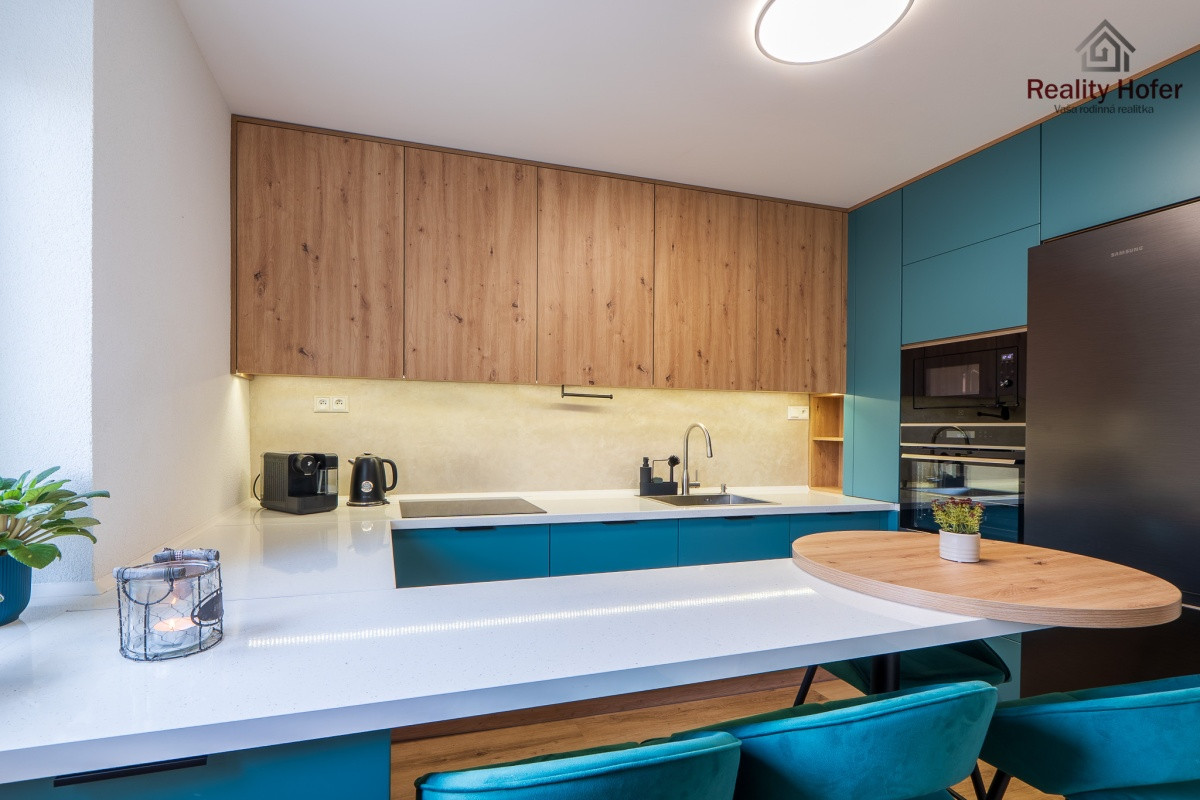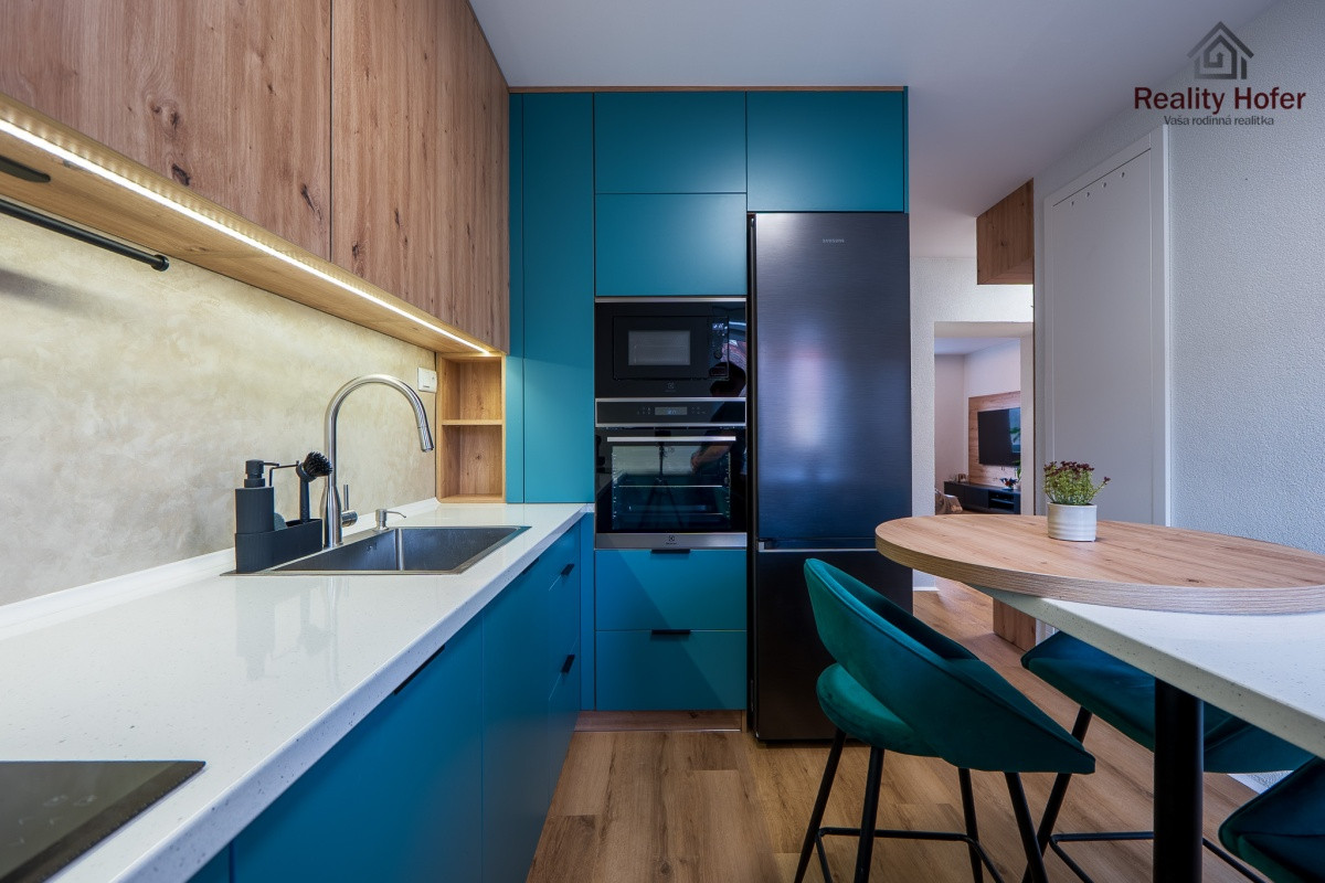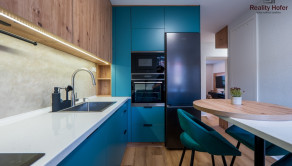 - kuchynská linka vrátane zabudovaných spotrebičov (umývačka, chladnička, mikrovlnka, el. rúra, indukčná varná doska)