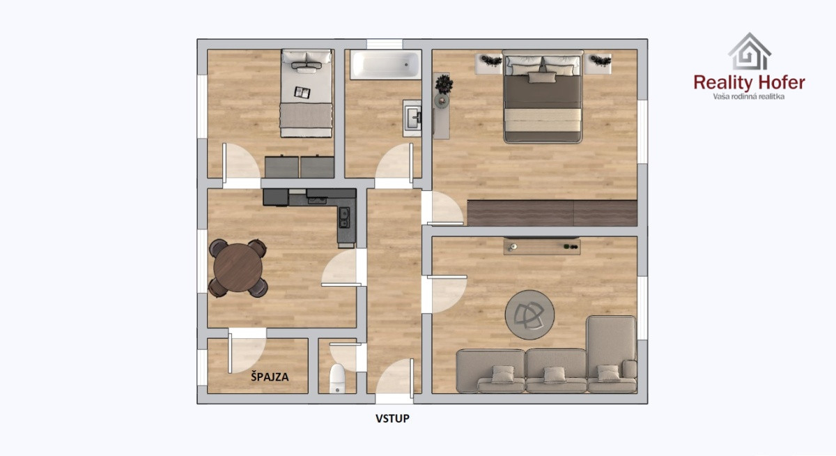 Dispozícia: vstupná chodba, kuchyňa, špajza, obývačka, 2x izba, kúpeľňa s vaňou, samostatné WC,